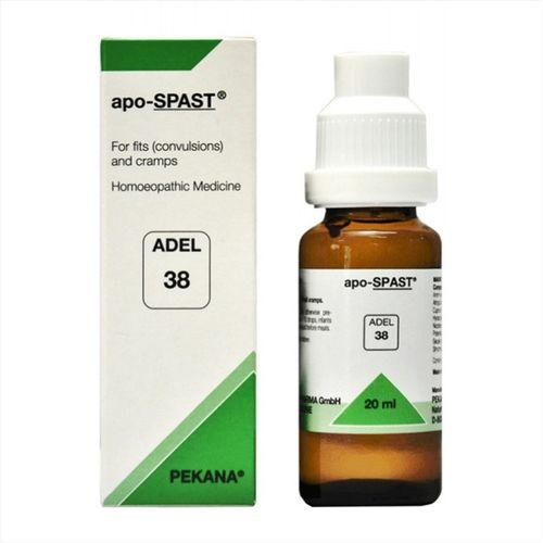 হোমিওপ্যাথিক Adel 38 apo-Spast মৃগী রোগের উপসর্গের চিকিৎসার জন্য বেশ কিছু হোমিওপ্যাথিক ভেষজ (ড্রপগুলিতে পাওয়া যায়) এর মালিকানাধীন মিশ্রণের মাধ্যমে ড্রপ করে। এতে অ্যামি ভিসনাগা, অ্যাট্রোপা বেলাডোনা ইত্যাদির মতো মূল উপাদান রয়েছে যা খিঁচুনি (ফিট) এবং ক্র্যাম্পে কাজ করে। এটি আকস্মিক ঝাঁকুনি (মোচড়ানো), পক্ষাঘাতের অবস্থা এবং কঠোরতার জন্যও নির্দেশিত।