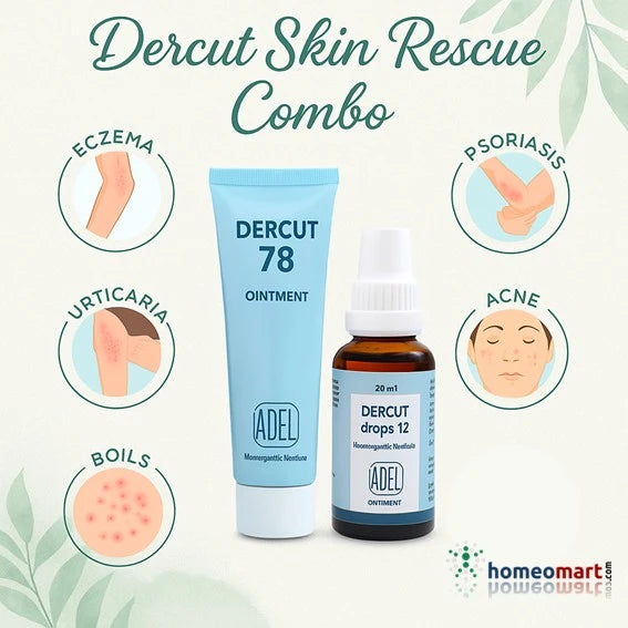 ADEL 12 Dercut Drops এবং ADEL 78 Dercut Ointment এর সমন্বয়মূলক ক্রিয়া ব্যবহার করে শান্ত, পরিষ্কার ত্বক অর্জন করুন। এই গতিশীল সংমিশ্রণটি একজিমা, সোরিয়াসিস, ব্রণ, ছত্রাক এবং ফোঁড়ার মতো স্থায়ী ত্বকের অবস্থা পরিচালনা করতে ভেতর থেকে কাজ করে। ড্রপগুলি রক্তকে বিশুদ্ধ করে এবং অভ্যন্তরীণ ডিটক্সকে সমর্থন করে, মলমটি পৃষ্ঠের জ্বালা, লালভাব এবং চুলকানিকে শান্ত করে। একসাথে, তারা সামগ্রিক, মৃদু এবং কার্যকর ত্বক পুনরুদ্ধার প্রদান করে - স্বাভাবিকভাবেই।
