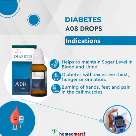 অ্যালেন A08 ডায়াবেটিস ড্রপস হল একটি বৈজ্ঞানিকভাবে প্রণয়নকৃত হোমিওপ্যাথিক প্রতিকার যা ডায়াবেটিস মেলিটাস এবং ডায়াবেটিস ইনসিপিডাসে আক্রান্ত ব্যক্তিদের রক্তে শর্করার ভারসাম্য নিয়ন্ত্রণ এবং সমর্থন করার জন্য ডিজাইন করা হয়েছে। এটি অত্যধিক তৃষ্ণা, ঘন ঘন প্রস্রাব, অঙ্গ-প্রত্যঙ্গে জ্বালাপোড়া, বাছুরের পেশীতে ব্যথা এবং সাধারণ দুর্বলতার মতো ক্লাসিক ডায়াবেটিস লক্ষণগুলিকে লক্ষ্য করে, একই সাথে ত্বকের আলসার এবং কার্বাঙ্কেলের মতো সম্পর্কিত জটিলতাগুলিকেও মোকাবেলা করে।