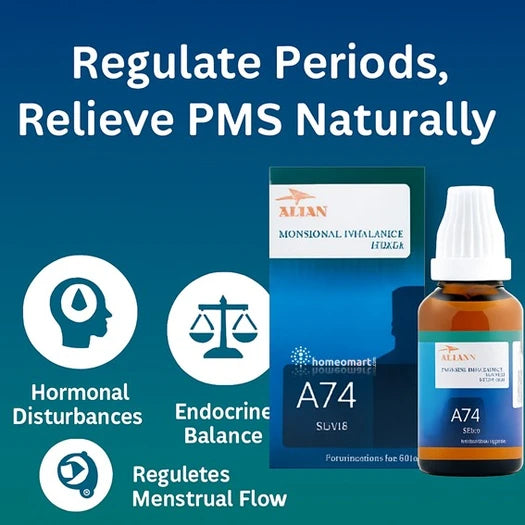 অ্যালেন A74, হোমিওপ্যাথিক হরমোন ভারসাম্যহীনতা ড্রপগুলি বিলম্বিত, স্বল্প বা অনুপস্থিত সময়কাল, যোনি শুষ্কতা এবং অত্যধিক চুল বৃদ্ধির জন্য নির্দেশিত হয়।