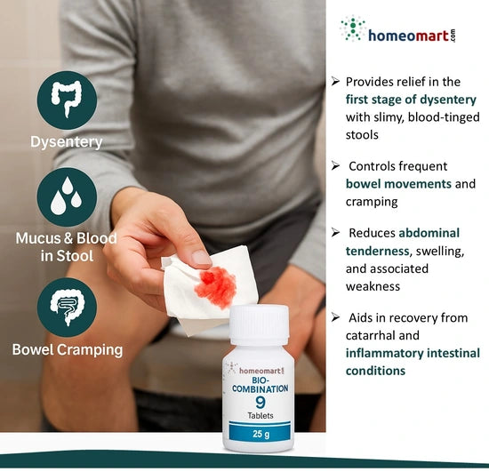 আমাশয় হল ঘন ঘন, বেদনাদায়ক মল, যার সাথে শ্লেষ্মা বা রক্ত থাকে, যা প্রায়শই আমাশয় ব্যাসিলাস বা অ্যামিবা (অ্যামিবিক আমাশয়) এর মতো সংক্রমণের ফলে ঘটে। এটি সাধারণত দূষিত খাবার, জল, অস্বাস্থ্যকর স্বাস্থ্যবিধি বা সংক্রামিত বাহকদের মাধ্যমে ছড়ায়। BC 09 এই অবস্থার প্রাথমিক এবং অগ্রগতিশীল পর্যায়ে সহায়তা প্রদান করে, প্রদাহ, খিঁচুনি এবং অন্ত্রের আলসারকে লক্ষ্য করে।