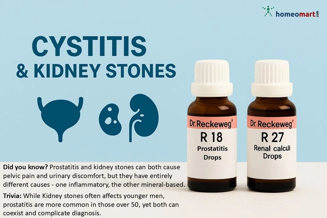 সিস্টাইটিস, প্রোস্টাটাইটিস এবং কিডনিতে পাথর : মায়োক্লিনিক অনুসারে, সিস্টাইটিস কখনও কখনও অন্যান্য অবস্থার জটিলতা হিসাবে দেখা দিতে পারে, যেমন ডায়াবেটিস, কিডনিতে পাথর এবং বর্ধিত প্রোস্টেট। ডাঃ রেকেওয়েগ প্রোস্টাটাইটিসের সময় সিস্টাইটিস রোগীদের জন্য R18+R27 সংমিশ্রণের পরামর্শ দেন R25 +R27।