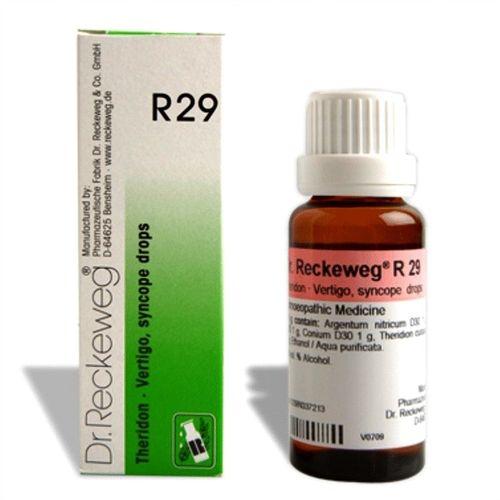 Dr. Reckeweg R29 হল একটি জার্মান মালিকানাধীন পেটেন্ট ফর্মুলেশন যা মেনিয়ারের রোগ, সেরিব্রাল স্ক্লেরোসিসের ফলে সেরিব্রাল ভাস্কুলার ব্যাঘাত, ট্র্যাভেল সিকনেস এবং স্বায়ত্তশাসিত স্নায়ুতন্ত্র (ANS)-নির্ভর সঞ্চালনের সাথে সম্পর্কিত ব্যাঘাত সহ বিভিন্ন কারণে মাথা ঘোরা মোকাবেলার জন্য ডিজাইন করা হয়েছে।