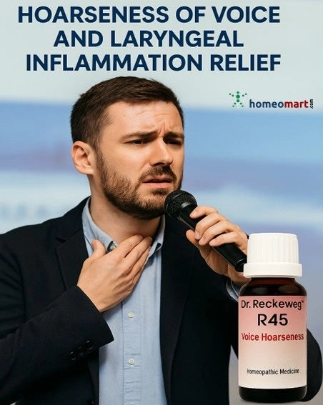 ডঃ রেকেওয়েগ R45 হল একটি জার্মান হোমিওপ্যাথিক ফর্মুলেশন যা বিশেষভাবে কণ্ঠস্বরের কর্কশতা, স্বরযন্ত্রের ক্যাটারা এবং সংশ্লিষ্ট কণ্ঠস্বরের চাপ দূর করার জন্য তৈরি করা হয়েছে। এটি বিশেষ করে সেইসব ব্যক্তিদের জন্য উপকারী যারা তাদের কণ্ঠস্বরের উপর খুব বেশি নির্ভর করেন - গায়ক, শিক্ষক, অভিনেতা, বক্তা - এবং কণ্ঠস্বরের ক্লান্তি, জ্বালা বা প্রদাহ অনুভব করতে পারেন। R45 প্রাকৃতিক উপাদানের একটি সমন্বয়মূলক মিশ্রণকে একত্রিত করে যা কণ্ঠস্বরের স্বাস্থ্যকে সমর্থন করে এবং স্বরযন্ত্রকে প্রশমিত করে।