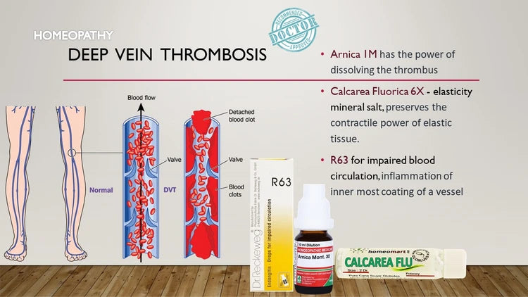 ডিভিটির হালকা থেকে মাঝারি ক্ষেত্রে, বিশেষ করে যখন জমাট বাঁধার আকার ছোট হয় এবং কোনও জরুরি চিকিৎসা ব্যবস্থা না থাকে, তখন হোমিওপ্যাথি প্রচলিত চিকিৎসার একটি পরিপূরক পদ্ধতি প্রদান করে। এটি তীব্র পর্যায়ের পরে দীর্ঘস্থায়ী লক্ষণগুলি পরিচালনা করতে, রক্ত সঞ্চালন এবং সামগ্রিক রক্তনালী স্বাস্থ্যকে সমর্থন করতেও সহায়ক।