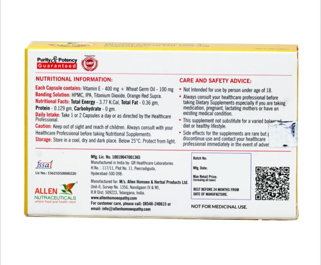 प्रति सर्विंग पोषण तथ्य: विटामिन ई – 400 मिलीग्राम + गेहूं के बीज का तेल – 100 मिलीग्राम