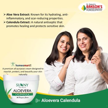 Bakson Sunny Aloe Vera Calendula Cream के साथ अपनी स्किनकेयर रूटीन को बदलें! एलो वेरा और कैलेंडुला से भरपूर, यह आपकी त्वचा को हाइड्रेट करता है, ठीक करता है, और उसे चमकदार और तरोताजा बनाता है।