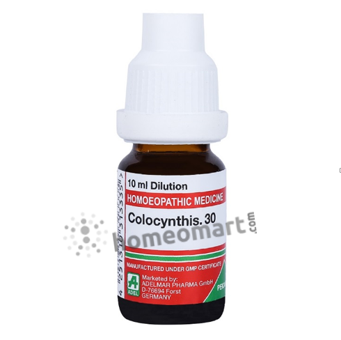 कोलोसिंथिस एक होम्योपैथिक तनु है जो कड़वे खीरे के पौधे से तैयार किया जाता है और पेट में ऐंठन दर्द के साथ पेट दर्द और दस्त के लिए अक्सर इस्तेमाल किया जाने वाला उपाय है। यह तंत्रिका संबंधी दर्द और गतिहीन जीवन शैली से उत्पन्न शिकायतों के लिए उपयुक्त है। इसलिए यह जीवनशैली संबंधी विकारों के लिए उपयुक्त है, खासकर उन महिलाओं में जो अत्यधिक मासिक धर्म शूल से पीड़ित हैं।