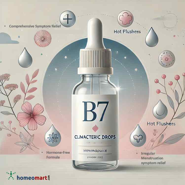 बैक्सन की बी7 क्लाइमेक्टेरिक ड्रॉप्स एक विशेष होम्योपैथिक लिक्विड है जिसे रजोनिवृत्ति से जुड़े लक्षणों से राहत दिलाने के लिए तैयार किया गया है, जिसमें अनियमित मासिक धर्म, हॉट फ्लश, कमज़ोरी और मानसिक थकान शामिल है। रजोनिवृत्ति के कारण अनियमित मासिक धर्म के लिए यह प्रभावी दवा हार्मोन-मुक्त है, जिससे अन्य उपचारों के साथ सुरक्षित उपयोग की अनुमति मिलती है।