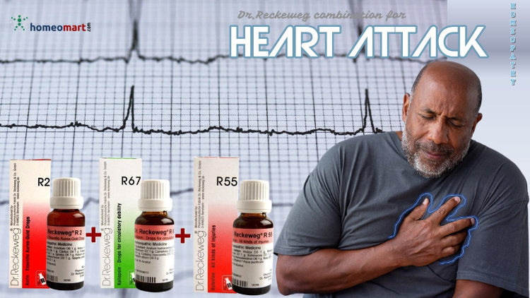 मायोकार्डियल इंफ़्रैक्ट के लिए R2+ R67 + R55 : कोरोनरी धमनी रोग (CAD) के कारण, "हार्ट अटैक" के परिणामस्वरूप मायोकार्डियम (हृदय के मांसपेशी ऊतक) के एक हिस्से में रक्त का प्रवाह कम हो जाता है या पूरी तरह से बंद हो जाता है। लक्षण छाती में दर्द है जो दबाव, जकड़न, दर्द, निचोड़ने या दर्द जैसा महसूस हो सकता है। दर्द या बेचैनी जो कंधे, हाथ, पीठ, गर्दन, जबड़े, दांत या कभी-कभी ऊपरी पेट तक फैल जाती है। हार्ट अटैक के बाद होम्योपैथी उपचार के रूप में, हर आधे घंटे में कुछ घंटों के लिए इस मिश्रण की 10-15 बूंदें दें।