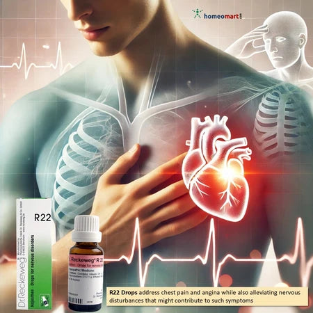 डॉ. रेकवेग आर22 ड्रॉप्स एक होम्योपैथिक उपाय है जिसे विशेष रूप से सीने में दर्द, तंत्रिका संबंधी गड़बड़ी और संबंधित लक्षणों के विभिन्न कारणों को संबोधित करने के लिए तैयार किया गया है। इस मालिकाना मिश्रण में नाजा ट्रिपुडियन, लैकेसिस और ग्रिंडेलिया रोबस्टा जैसे शक्तिशाली होम्योपैथिक तत्व शामिल हैं, जिनमें से प्रत्येक को सीने में तकलीफ, घुटन और उत्पीड़न (मानसिक या शारीरिक संकट) को कम करने की उनकी क्षमता के लिए चुना गया है। यह पेट फूलने और एनजाइनस सीने में दर्द (एनजाइना पेक्टोरिस से जुड़ा) जैसी स्थितियों के लिए भी प्रभावी है।