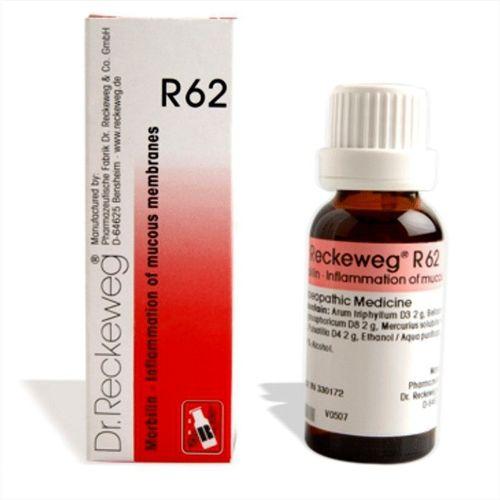होम्योपैथिक डॉ.रेकवेग आर 62 ड्रॉप्स वयस्कों और बच्चों में खसरे के लक्षणों के लिए संकेतित हैं और कई होम्योपैथिक जड़ी-बूटियों (ड्रॉप्स में उपलब्ध) के मालिकाना मिश्रण के माध्यम से इस पर काम करते हैं। इसमें अरुम ट्राइफिलम, बेलाडोना आदि जैसे प्रमुख तत्व हैं जो श्लेष्म झिल्ली की सूजन, आंखों की सूजन और खसरे (बुखार और लाल चकत्ते पैदा करने वाली संक्रामक वायरल बीमारी) पर काम करते हैं।