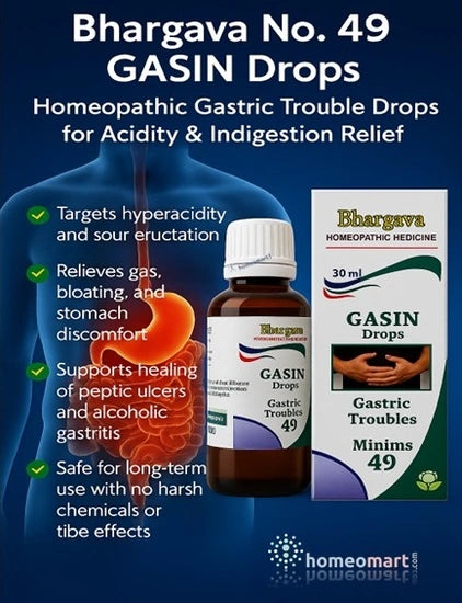 भार्गव नंबर 49 गैसिन ड्रॉप्स - एसिडिटी और अपच से राहत के लिए होम्योपैथिक गैस्ट्रिक ट्रबल ड्रॉप्स