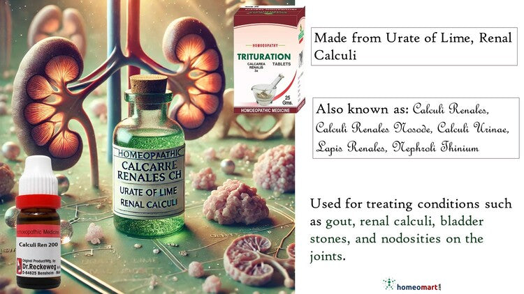 कैलकुली रेनैलिस गुर्दे की पथरी, गठिया और गांठों के साथ जोड़ों के दर्द जैसी स्थितियों के इलाज के लिए उपयुक्त है। पथरी के निकलने के दौरान होने वाले दर्द को कम करने और दोबारा होने से रोकने की इसकी क्षमता इसे एक महत्वपूर्ण उपाय बनाती है।