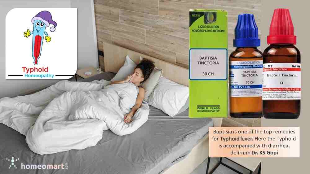 - क्रिया : पेट दर्द और दस्त के साथ ढीले, दुर्गंधयुक्त मल के लिए, बैप्टीशिया टिंक्ट 200 आदर्श विकल्प है। यह पेट में गड़गड़ाहट और सुस्ती को कम करता है, जो आमतौर पर टाइफाइड में देखा जाता है। जल्दी सेवन करने से अचानक थकान और उदासीनता जैसे लक्षणों को कम करके बीमारी की अवधि कम की जा सकती है।