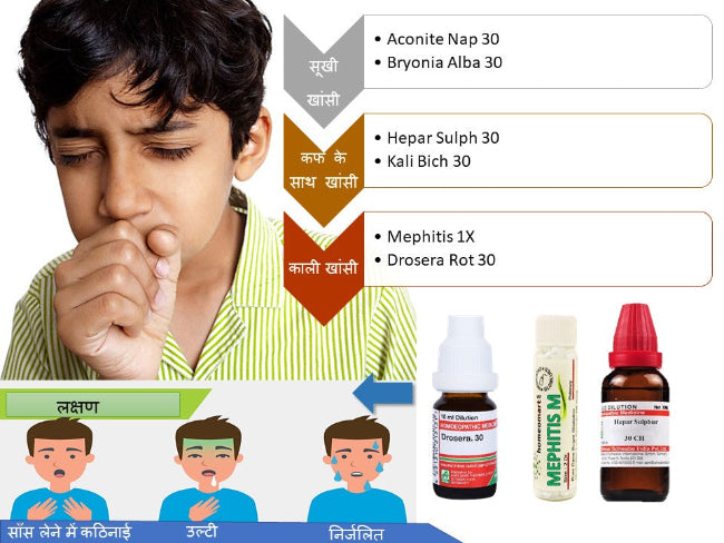 एकोनिटम नेपेलस 6X : अचानक, तीव्र लक्षणों के शुरू होते ही उनके उपचार में अपनी प्रभावशीलता के लिए जाना जाता है। यह कर्कश, सूखी और कर्कश खांसी को कम करने में मदद करता है जो आधी रात के आसपास और भी बदतर हो जाती है।