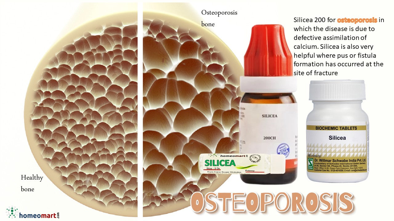 - संकेत: सिलिकिया 200 ऑस्टियोपोरोसिस के रोगियों में फ्रैक्चर के इलाज के लिए एक उत्कृष्ट उपाय है, खासकर जब स्थिति कैल्शियम के दोषपूर्ण आत्मसात के कारण होती है। मेयो क्लिनिक के अनुसार, कैल्शियम के सेवन की आजीवन कमी या खराब कैल्शियम अवशोषण ऑस्टियोपोरोसिस के विकास में महत्वपूर्ण भूमिका निभाता है, जिससे हड्डियों का घनत्व कम हो जाता है, हड्डियों का जल्दी नुकसान होता है और फ्रैक्चर का खतरा बढ़ जाता है। सिलिकिया शरीर की कैल्शियम को आत्मसात करने की क्षमता को बढ़ाता है, जिससे हड्डियों के स्वास्थ्य का समर्थन होता है। यह उन मामलों में भी फायदेमंद है जहां फ्रैक्चर साइट पर मवाद या फिस्टुला का गठन हुआ है, टूटी हुई हड्डियों के कुशल संयोजन को बढ़ावा देता है और हड्डी के टुकड़ों को हटाने में सहायता करता है।