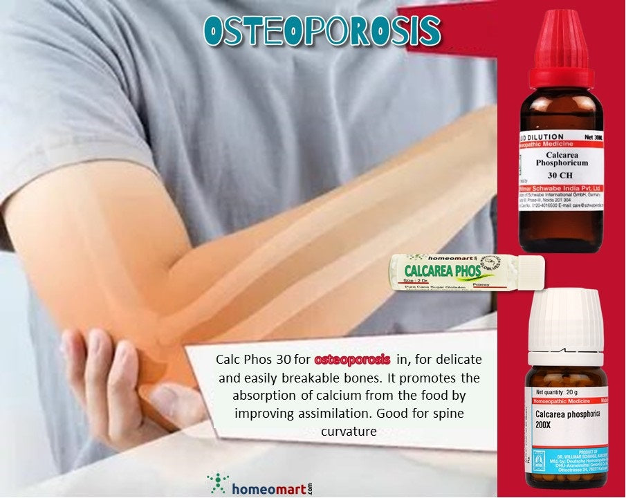 - संकेत: कैल्केरिया फॉस 30 ऑस्टियोपोरोसिस के इलाज के लिए एक प्रमुख होम्योपैथिक उपाय है, खासकर उन मामलों में जहां हड्डियां नाजुक होती हैं और फ्रैक्चर होने का खतरा होता है । यह शरीर की आत्मसात प्रक्रिया को बढ़ाकर भोजन से कैल्शियम के प्राकृतिक अवशोषण में मदद करता है। यह उपाय उन व्यक्तियों के लिए विशेष रूप से प्रभावी है जिनकी गर्दन की हड्डियाँ बहुत छोटी और कमज़ोर हैं और वे एक बड़े सिर को सहारा नहीं दे सकती हैं, और जिनके हाथ-पैरों की हड्डियाँ कमज़ोर और नाजुक हैं। कैल्केरिया फॉस 30 ऑस्टियोपोरोसिस के लिए एक उत्कृष्ट निवारक उपाय के रूप में कार्य करता है, हड्डियों के घनत्व में सुधार करता है और हड्डियों की ताकत के नुकसान को स्वाभाविक रूप से धीमा करता है। यह हड्डियों के स्वास्थ्य को बनाए रखने और फ्रैक्चर को रोकने के लिए होम्योपैथी में अत्यधिक अनुशंसित पूरक है।