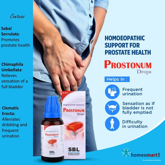 शान से उम्र बढ़ाएँ और मूत्र संबंधी परेशानियों को पीछे छोड़ दें! SBL प्रोस्टोनम ड्रॉप्स BPH (सौम्य प्रोस्टेटिक हाइपरप्लासिया) की असुविधाओं पर काबू पाने में आपका भरोसेमंद सहयोगी है, जो आपको बार-बार शौचालय जाने की रुकावटों से मुक्त रहने में सक्षम बनाता है।