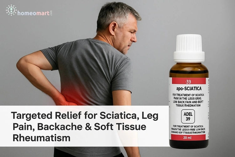 ADEL 39 apo-SCIATICA Drops is a comprehensive homeopathic formulation indicated for the treatment of sciatica, low back pain, nerve pain in legs or arms, and soft tissue rheumatism. The remedy works holistically to reduce inflammation, relieve muscular and nerve pain, and address underlying metabolic imbalances contributing to chronic discomfort.