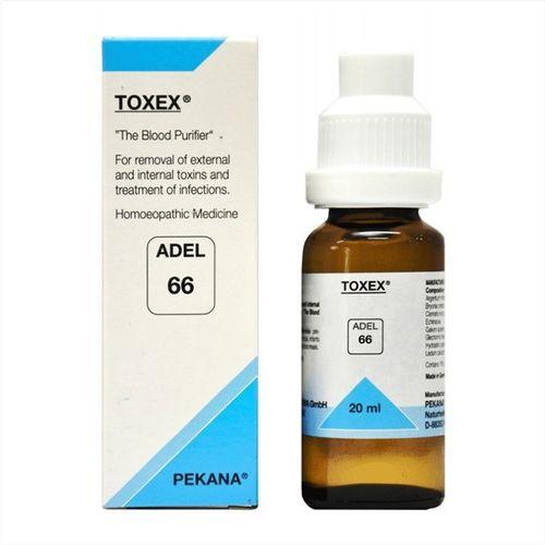 Product Overview: Adel 66 (Toxex) drops are formulated as a homeopathic remedy designed to support the body's natural detoxification processes. This product is intended to complement the body’s efforts to eliminate toxins that may arise from various sources, including environmental pollutants, heavy metals, and the consumption of alcohol and certain medications.