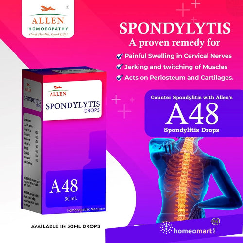 Allen A48 Spondylitis Drops are a specialized homeopathic formulation designed to relieve painful cervical nerve swelling, muscle jerking or twitching, and stiffness caused by degenerative spinal conditions. It acts deeply on the periosteum and cartilages, supporting joint flexibility and nervous system balance.