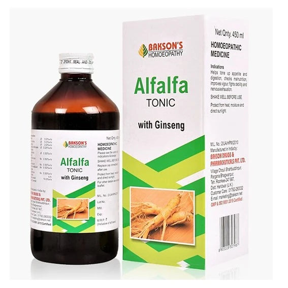 Bakson's Alfalfa Tonic with Ginseng is a unique homeopathic formulation that blends the nutritional power of Alfalfa with the therapeutic benefits of Ginseng and other proven homeopathic remedies. This tonic is designed to combat fatigue, enhance digestion, strengthen the nervous system, and promote overall well-being. It is especially beneficial for individuals experiencing physical exhaustion, emotional stress, or weakness due to illness or inadequate rest.