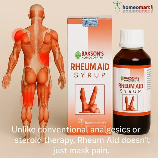 Bakson’s Rheum Aid Syrup is a trusted homeopathic formulation designed to relieve joint pain, arthritis, rheumatism, muscular stiffness, sciatica, and gout. It works by strengthening the musculoskeletal system, reducing inflammation, and restoring mobility—without the side effects of painkillers or steroids.