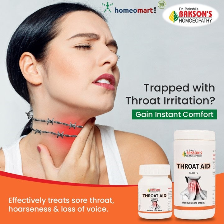 Bakson Throat Aid Tablets is a homeopathic medicine for quick relief from sore throat. It is a balanced composition of effective homeopathic herbs like Belladona 6x, Ferrum Phos 6x, Senega 6x, etc for treating throat problems.