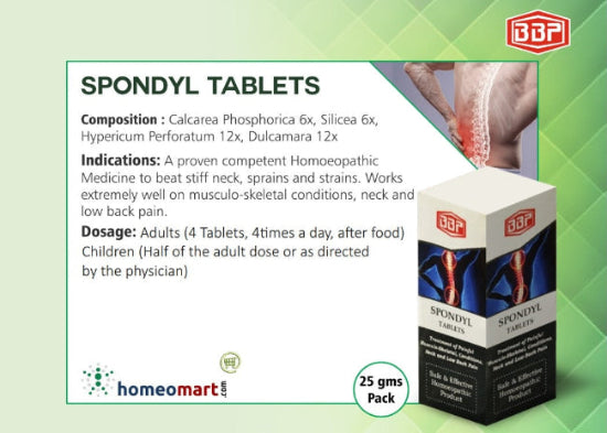 Rediscover comfort and mobility with BBP Spondyl Tablets, your homeopathic ally against cervical spondylosis and musculoskeletal pain.