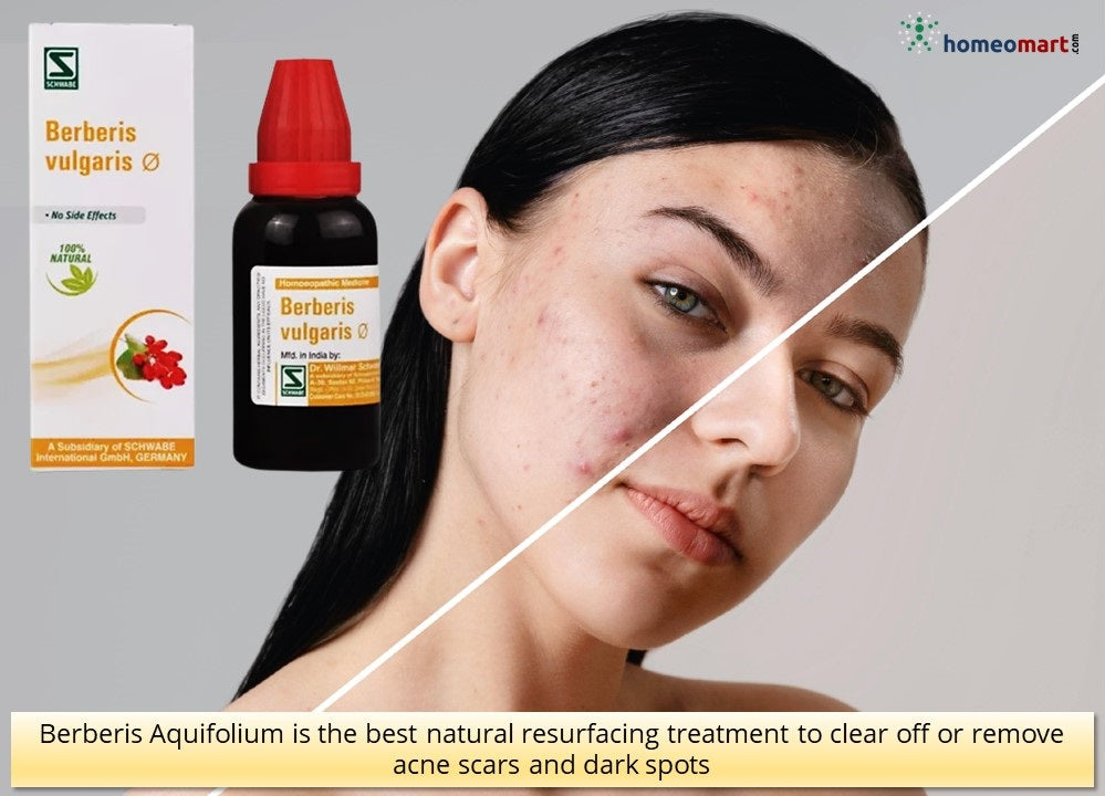 - Berberis Aquifolium Q is considered to be a specific for pimples. It is best for acne that result in formation of acne scars. Acne scars are formed due to too much collagen during healing. Berb Aquifolium is the best natural resurfacing treatment to clear off or remove acne scars. It is the first choice of homeopaths as homeopathy cleanser medicine for pimples and dark spots