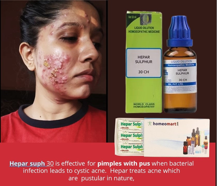 - Hepar Suph 30 is effective for pimples with pus when bacterial infection leads to cystic acne. Hepar treats acne which are pustular in nature, it is suited to acne of youth. Hepar sulph is prescribed when the pimples are painful in nature. Pus or blood stained pus oozes out from the pimples.