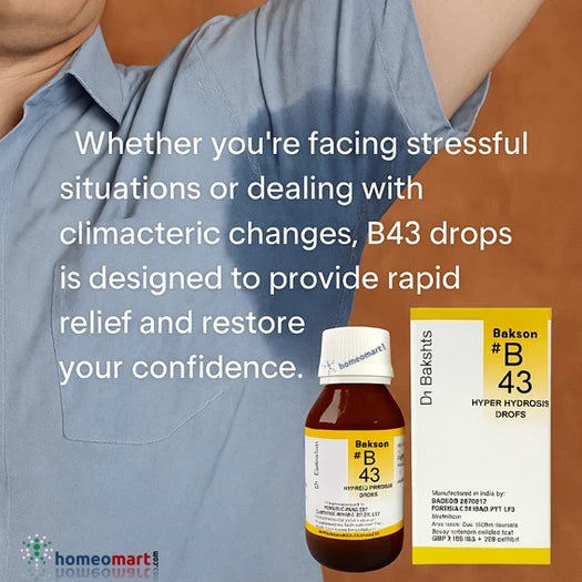 Stay Dry, Stay Comfortable - Dr. Bakshi's B43 Hyperhydrosis Drops offer a natural, effective solution to manage excessive sweating. Whether you're facing stressful situations or dealing with climacteric changes, our homeopathic formula is designed to provide rapid relief and restore your confidence. Say goodbye to uncomfortable sweat episodes and hello to all-day comfort with B43 Drops!