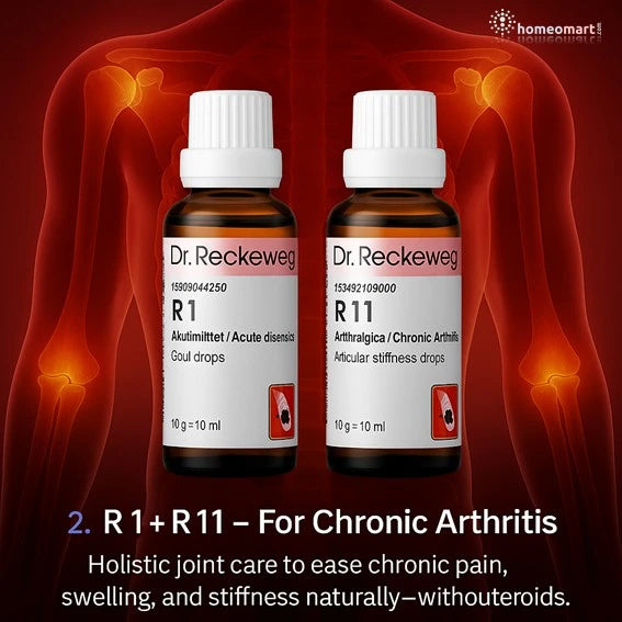 R11 targets joint inflammation and stiffness in chronic arthritis with Rhus tox and Causticum. R1 supports by controlling inflammation and pain with Apis and Merc. sol.. Ideal for long-standing joint disorders, this combo offers internal anti-inflammatory and anti-rheumatic effects.