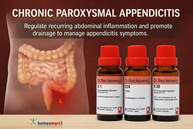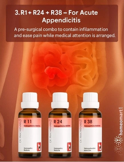 This triple combo addresses inflammation, organ lining sensitivity, and immune response. R1 reduces inflammation, R24 manages sharp abdominal pain, and R38 supports local detoxification and drainage. Used together, they reduce recurrence of appendicitis attacks.