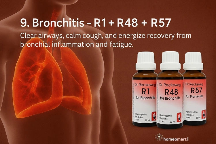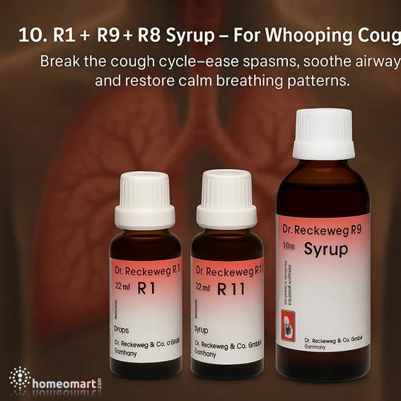 R9 provides targeted relief from spasmodic cough and chest tightness using Drosera and Ipecacuanha. R8 syrup soothes irritated airways. R1 reduces secondary infections. Together, they control the intensity and frequency of coughing fits.