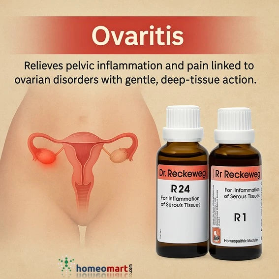 Ovarian inflammation is eased by R24 through Kalium carbonicum and Cimicifuga, which target lower abdominal pain. R1 adds infection control, particularly when ovaritis has an acute onset. Combined, they manage pain, swelling, and underlying causes effectively.