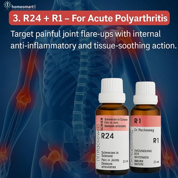 For rheumatoid-type arthritis, R24 relieves deep-seated inflammation in serous membranes and joints, while R1 manages swelling and pain. Ingredients like Bryonia and Colocynthis reduce stiffness, while Belladonna and Hepar sulphuris help suppress joint abscesses and tenderness.