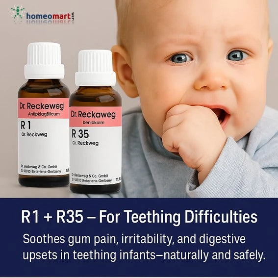 R35 eases dentition troubles in children with Chamomilla (irritability and gum pain) and Belladonna (fever). It reduces drooling, sleep disturbances, and diarrheal episodes commonly associated with teething. R1 soothes red and swollen gums as a tooth tries to break through in some babies