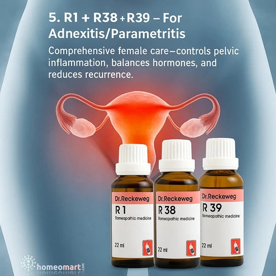 R38 targets pelvic inflammation and uterine infections using Pulsatilla and Sepia. R39 regulates hormonal and ovarian function. R1 complements with antimicrobial action. This trio offers comprehensive coverage for female reproductive infections.