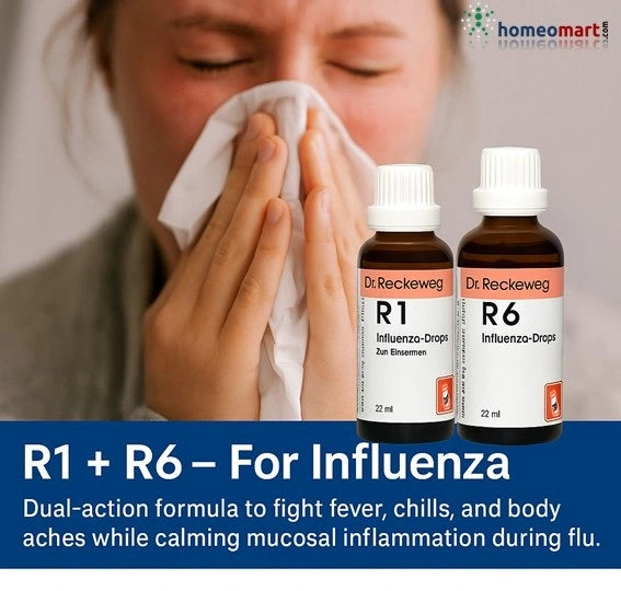 This combo combats flu with systemic and inflammatory support. R6 tackles catarrhal inflammation and flu symptoms using Aconitum and Eupatorium perf. while R1 acts as a non-steroidal anti-inflammatory, managing acute infections with Belladonna and Hepar sulphuris. Together, they reduce fever, congestion, and respiratory distress.
