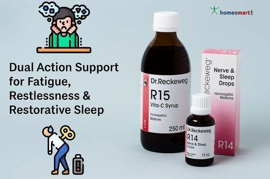 Combining Dr. Reckeweg R15 Vita-C Syrup and Dr. Reckeweg R14 Nerve & Sleep Drops offers comprehensive support for nervous exhaustion. While R15 revitalizes energy levels and combats fatigue, R14 calms the nerves, improves sleep quality, and reduces mental restlessness. Together, they restore balance and promote emotional and physical resilience.