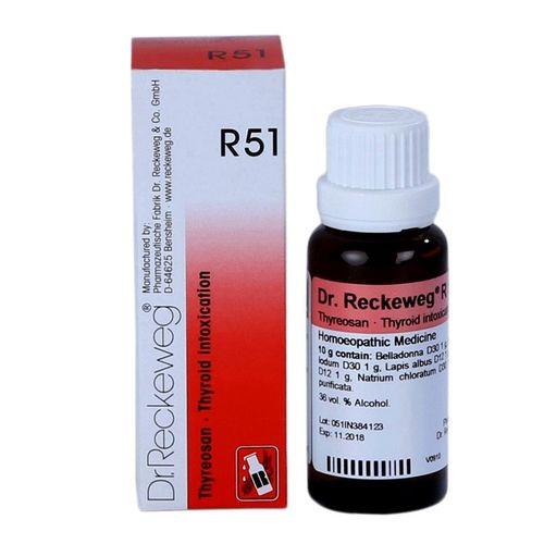 Dr.Reckeweg R 51 homeopathic drops has a detoxification effect on thyroid glands. It has key Ingredients like belladonna, jodum etc., that acts on hyperthyroidism (thyrotoxicosis), Basedow's disease (disease characterized by enlargement of the thyroid gland, prominence of the eyeballs, and inordinate action of the heart). It also addresses exopthalmia (condition marked by bulging eye-balls), intoxication of the thyroid glands associated with the trembling of hands. It is also indicated for process of sweating (perspiration), state of being abnormally thin or weak (emaciation) and diarrhea.