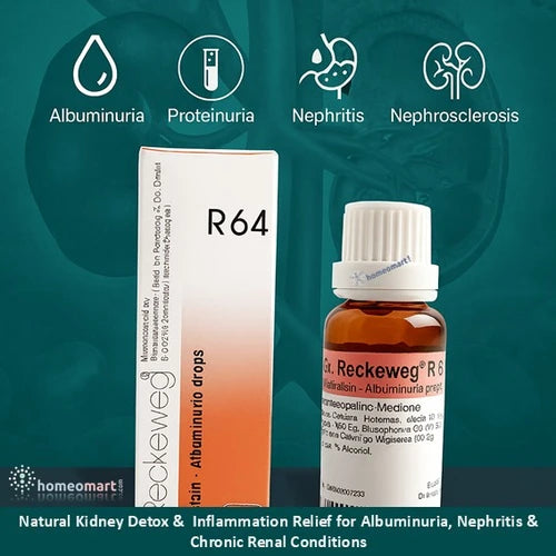 Dr. Reckeweg R64 is a specialized homeopathic formulation designed to address chronic kidney conditions such as albuminuria, proteinuria, nephrosis, and chronic nephritis. It acts at the root of inflammation in the urogenital tract and offers holistic support for kidney function, especially in patients with diabetes, hypertension, or pregnancy-related kidney issues.