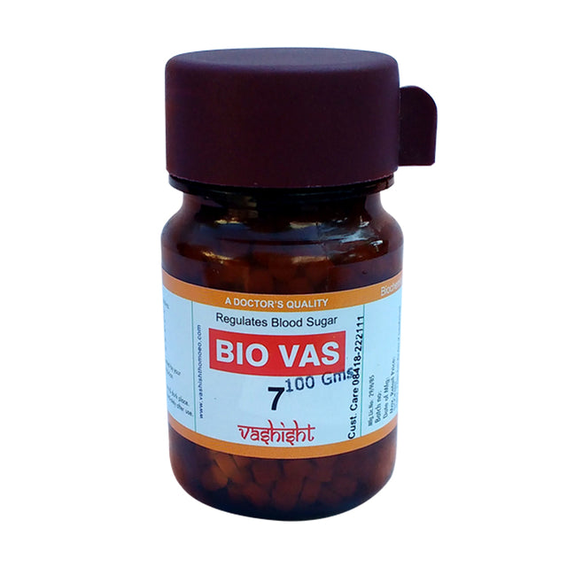 Dr.Vashisht Biocombination Bio Vas 7 is expertly formulated to provide relief from various conditions associated with diabetes. This homeopathic remedy enhances glucose assimilation, supports improved kidney and liver functions, and addresses symptoms commonly experienced by diabetic patients such as profuse urination, calf muscle pain, intense thirst, dry lips, sleeplessness, and nervous weakness.