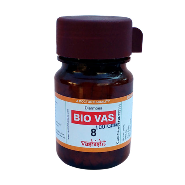 Dr.Vashisht Biocombination Bio Vas 8 is indicated in diarrhea during dentition, thin watery, greenish stool, foul with un¬digested food. Stool with blood or yellow, loose morning stools which at times is involuntary while passing flatus.
