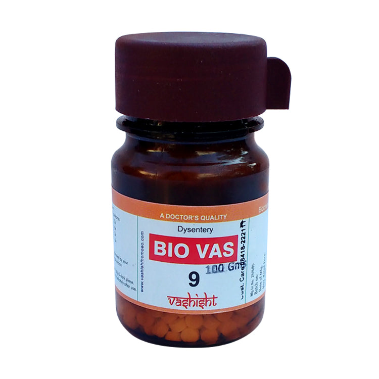 Dr.Vashisht Biocombination Bio Vas 9 is indicated in Dysentery with mucus and blood. Cramping pain before or after defecation. Constant urging for defecation.