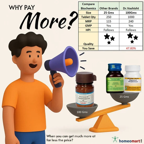 Discover unbeatable value with Dr. Vashisht Biochemic Tablets! With 1100 tablets (100g) offered at just ₹240, you save up to 47.83% compared to other brands offering only 250 tablets (25g) at ₹115. Not only do you get more quantity for your money, but you also enjoy uncompromised quality that follows GMP and HPI standards.