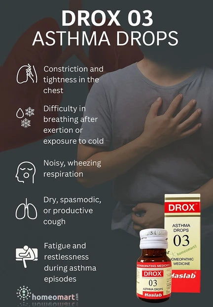 DROX 3 Asthma Drops provide targeted homeopathic relief from asthma, wheezing, and bronchial inflammation. Formulated with Arsenic Alb, Belladonna, and Eriodictyon, it soothes spasms, clears mucus, and supports lung function—without side effects.