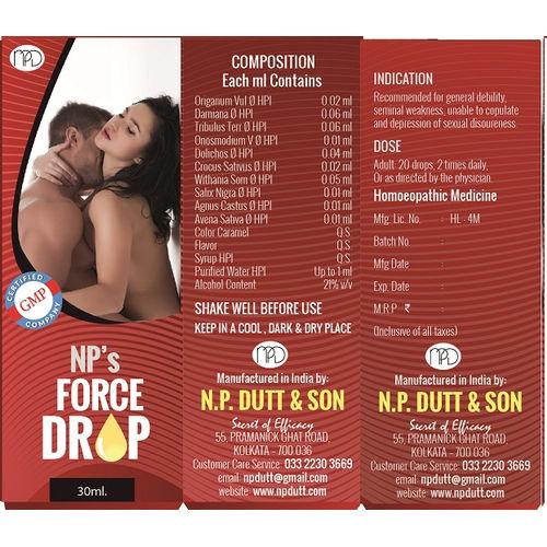 Force Drops from N.P. Dutta is a Quality aphrodisiac oral liquid that address sexual weakness arising out of various reasons. It is recommended for general debility, seminal weakness, unable to copulate and depression of sexual disoureness.